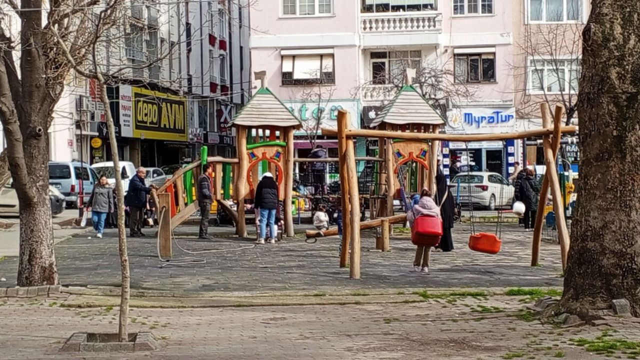 Şehir merkezinde yer alan parkta bulunan ahşap oyun grupları ve salıncaklar gün boyunca çocukların kullanımındaydı. Aileler banklarda oturarak çocuklarını takip ederken, oyun alanı çevresinde sosyal hareketlilik yaşandığı görüldü.