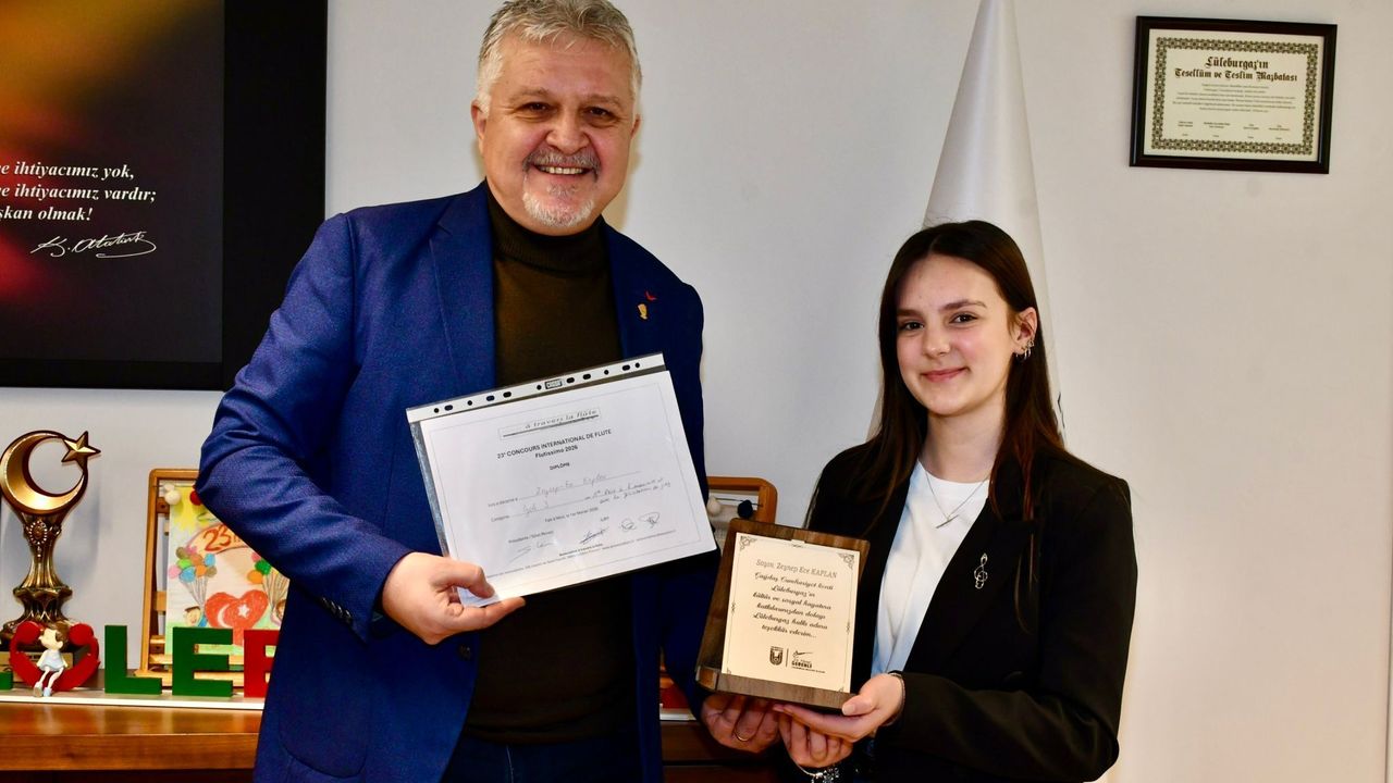 Lüleburgaz Belediye Başkanı Murat Gerenli, Flutissimo 2026 Flüt Festivali ve Yarışması’nda elde ettiği birincilikle ilçeye büyük gurur yaşatan Gençlik Korosu üyesi Zeynep Ece Kaplan’ı makamında misafir etti. Sanat alanındaki başarısıyla dikkat çeken genç yetenek, ulusal düzeyde önemli bir derece elde etti.