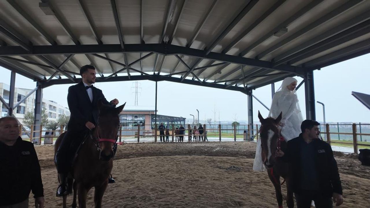 Dün, Esenyurt’ta Behçet Demir ve Dilara Eren çifti sıra dışı bir organizasyon ile nikah kıyarak dünya evine girdi. Esenyurt’ta bir süre önce belediyeye ait at binicilik tesisinde tanışan Behçet Demir ve Dilara Eren, aldıkları evlilik kararının ardından klasik bir nikah töreni yerine ortak tutkularını yansıtan bir tören yapmak istedi. Gelinlik ve Damatlıkla ata binen çift, çevredekilerin şaşkın bakışlarıyla dünya evine girdi.