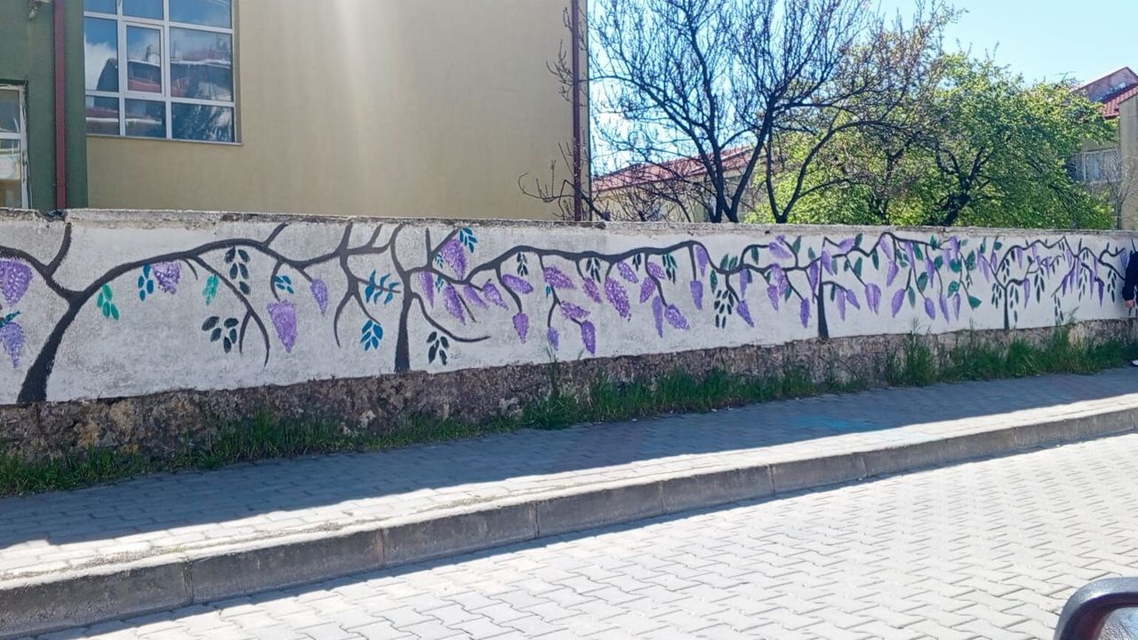 Sokağın bir yanında, bir okulun çevre duvarına ustalıkla işlenmiş mor salkım duvar resmi yer alıyor. Kıvrılan dallar, sarkan çiçek demetleri ve turkuaz-mor renk uyumuyla hayata geçirilen bu tablo, izinli ve planlı bir kentsel sanat projesinin ürünü. Öğrenciler ve veliler yapıtı ilgiyle incelerken, duvar sokağa adeta bir galeri kimliği kazandırıyor.