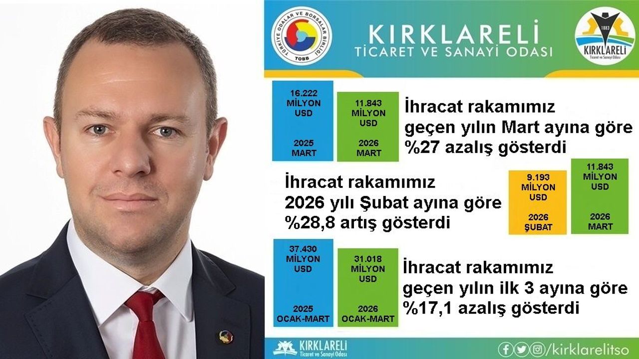 Kırklareli Ticaret ve Sanayi Odası Yönetim Kurulu Başkanı Soner Ilık, 2026 yılı Mart ayına ilişkin ihracat verilerini açıkladı. Ilık, Kırklareli merkezli firmaların Mart ayında 11 milyon 843 bin dolar ihracat gerçekleştirdiğini belirtti.