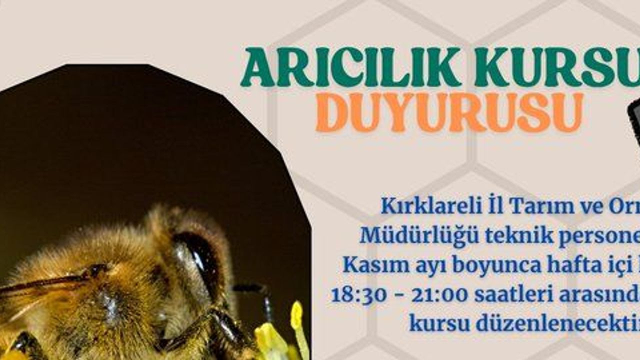 “Kırklareli İl Tarım ve Orman Müdürlüğü teknik personelince, Kasım ayı boyunca hafta içi her gün 18:30 - 21:00 saatleri arasında arıcılık kursu düzenlenecektir. Kurs, Kırklareli Halk Eğitimi Merkezi iş birliğiyle gerçekleştirilecektir. Katılmak isteyen vatandaşlarımız, Kırklareli Halk Eğitimi Merkezi Müdürlüğü’ne başvurarak kayıt yaptırabilirler. Üretimin bereketine katkı sunmak isteyen tüm vatandaşlarımızı kursumuza bekliyoruz!”