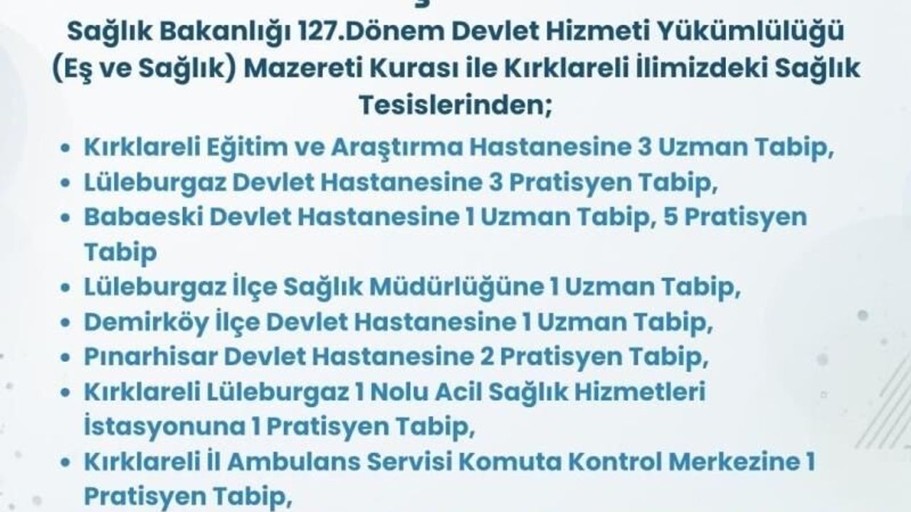 Edinilen bilgiye göre, il genelindeki sağlık kuruluşlarına 6'sı uzman tabip, 15'i pratisyen tabip olmak üzere çeşitli branşlarda toplam 21 hekim ataması gerçekleştirilecek. Tahsis edilen kadrolar kapsamında; Kırklareli Eğitim ve Araştırma Hastanesi'ne 3 uzman tabip, Lüleburgaz Devlet Hastanesi'ne 3 pratisyen tabip, Babaeski Devlet Hastanesi'ne 1 uzman ve 5 pratisyen tabip görevlendirildi. Ayrıca Lüleburgaz İlçe Sağlık Müdürlüğü'ne 1 uzman tabip, Demirköy İlçe Devlet Hastanesi'ne 1 uzman tabip, Pınarhisar Devlet Hastanesi'ne ise 2 pratisyen tabip kadrosu açıldı.