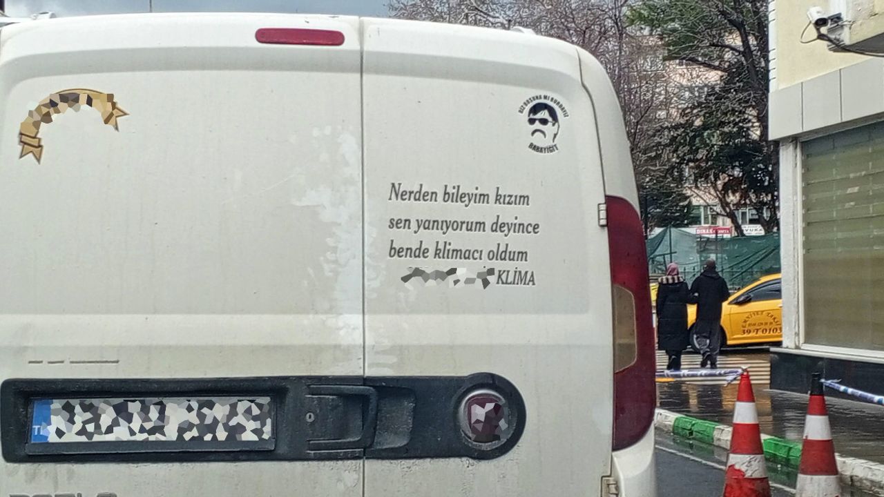 Kentte seyir halinde olan bir servis aracının arka kapısında yer alan yazı, sıradan bir reklam metninden çok espri niteliği taşıyor. “Nereden bileyim… ‘yanıyorum’ deyince ben de klimacı oldum” şeklinde kurgulanan mesaj, gündelik hayatta sıkça kullanılan bir sözün meslekle ilişkilendirilmesi üzerine kurulmuş.