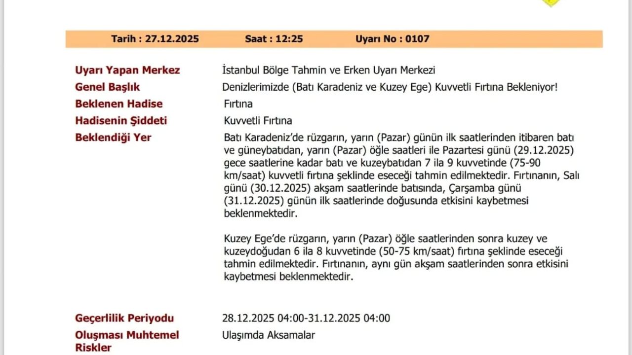 Yapılan bilgilendirmeye göre, fırtınanın 28 Aralık 2025 Pazar günü saat 04.00 itibarıyla başlayacağı ve 31 Aralık 2025 Çarşamba günü saat 04.00’e kadar etkisini sürdüreceği belirtildi. Bu süre zarfında denizlerde ve kıyı kesimlerinde olumsuz hava koşullarının etkili olmasının beklendiği ifade edildi.