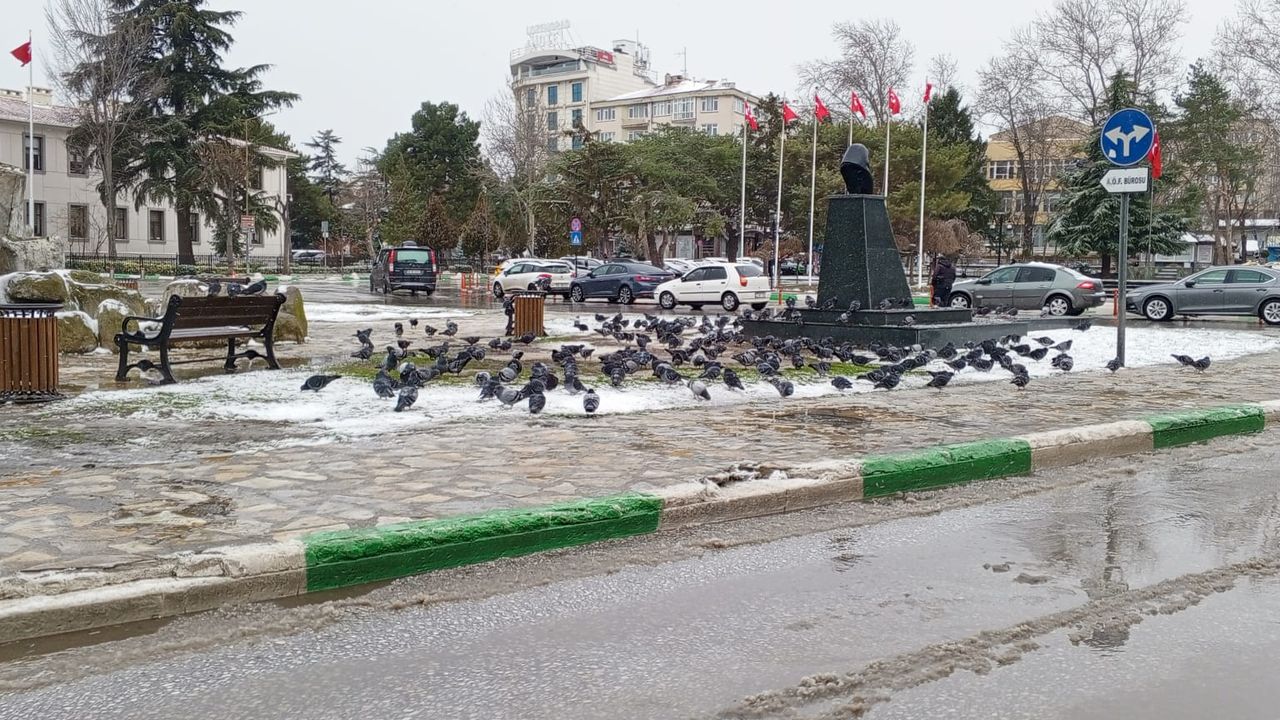 Meydanda biriken kar ve eriyen suların oluşturduğu ıslak zemin, kış şartlarının günlük yaşam üzerindeki etkisini bir kez daha ortaya koydu. Bankların ve anıt çevresinin önünde toplanan güvercinler, zaman zaman toplu halde hareket ederek besin aradı. Arka planda araç trafiğinin sürdüğü görülürken, meydandaki bayraklar ve ağaçlar kış mevsiminin şehirdeki izlerini yansıttı.